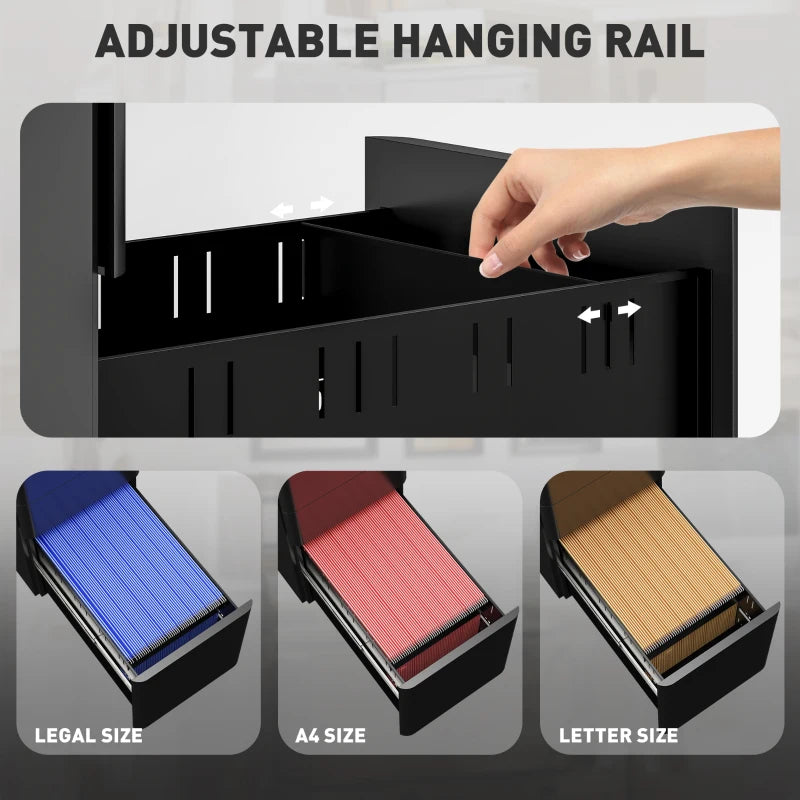 - Effortless file organization: Manage your documents effectively with the spacious drawer of this small filing cabinet, which includes an adjustable rail to hold A4, legal, and letter-sized files. Say goodbye to messy piles of paper and keep everything neatly arranged.